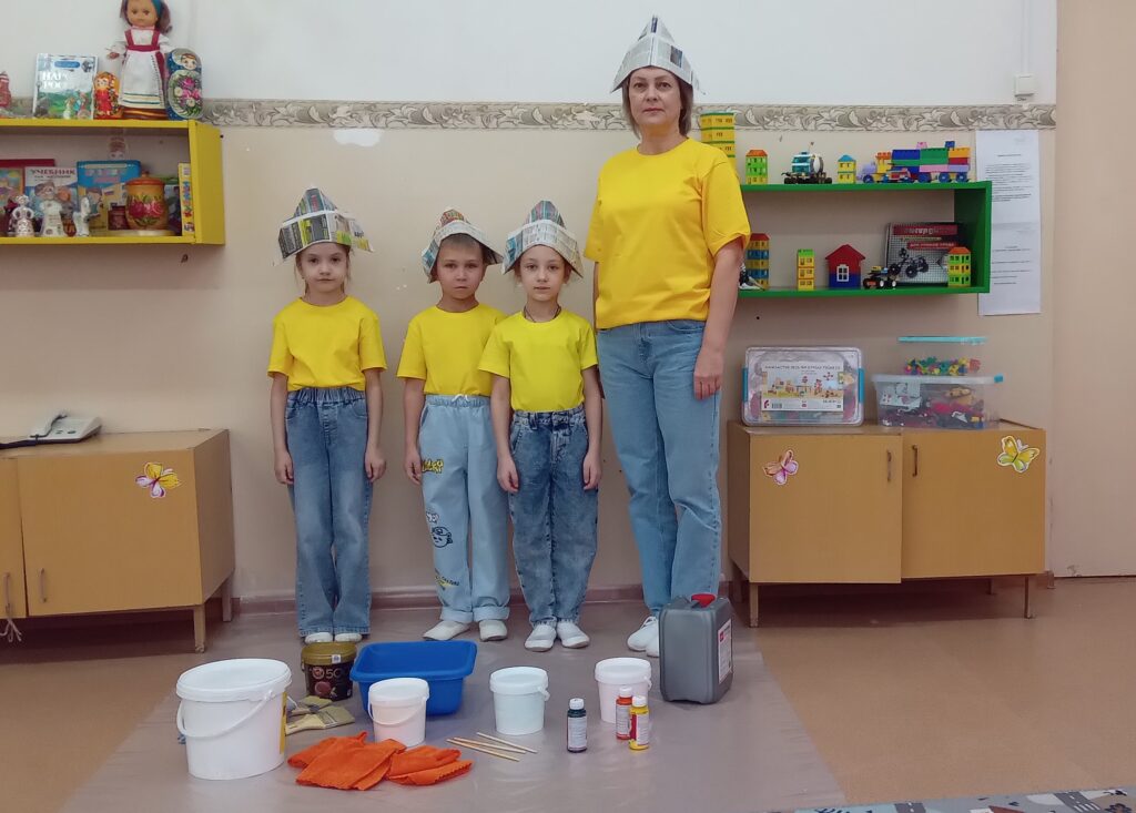 Команда «Малярики» — Пилюгин Кирилл, Кособокова Анна, Чечикова Ульяна (руководитель Макарова О.А.) представили профессию маляра.